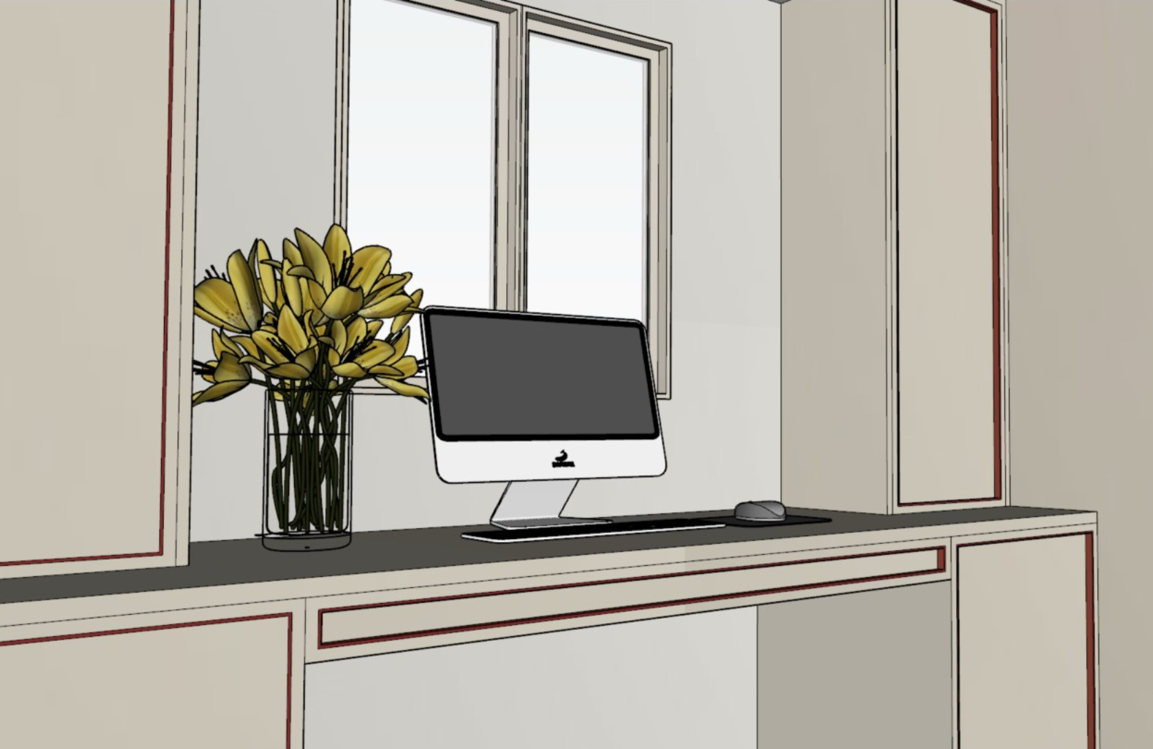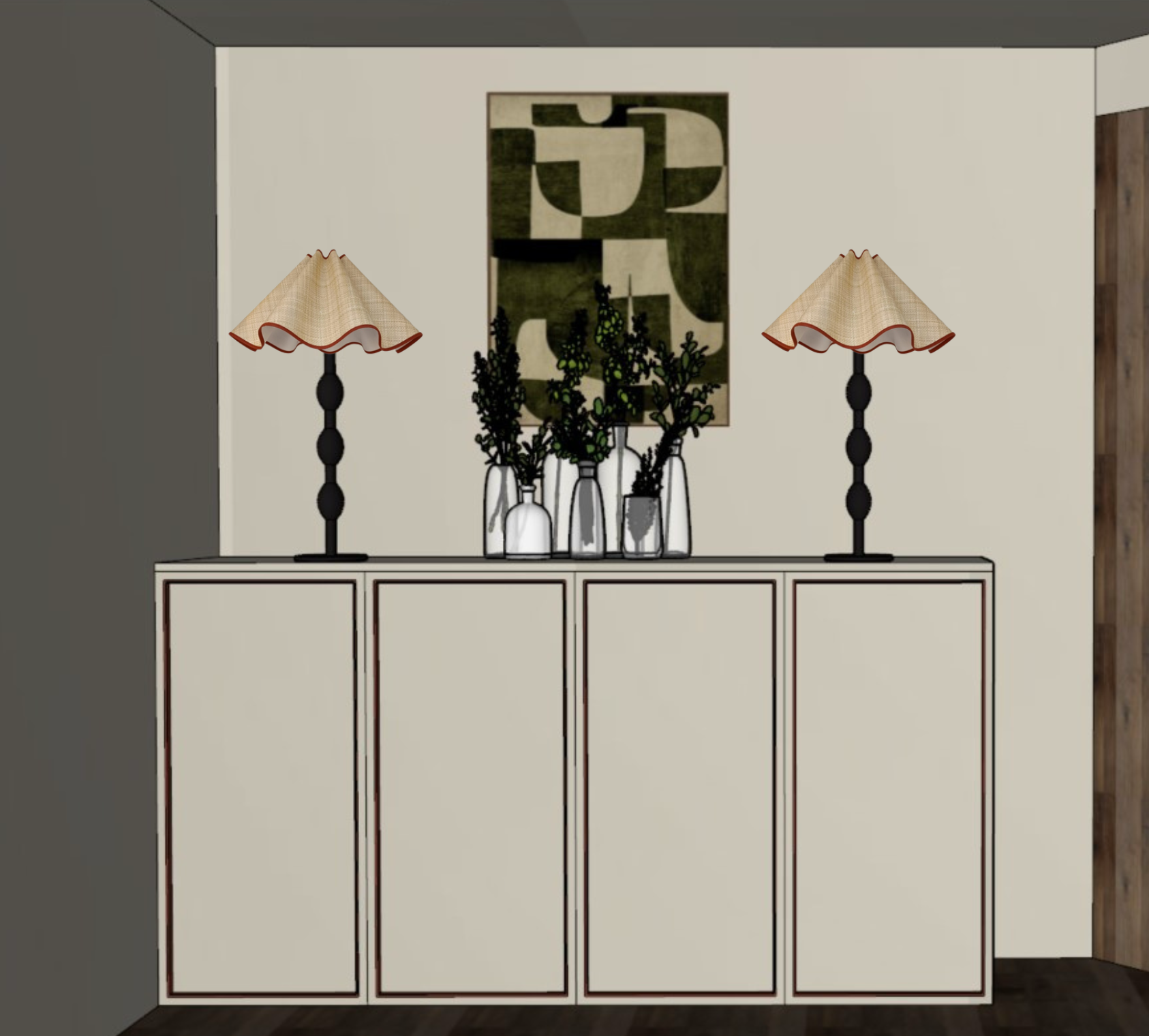 The scheme includes natural textures, tonal walls and warm layered lighting,